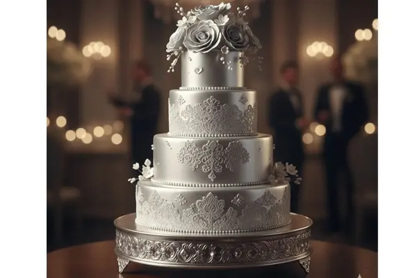 طراحی خاص و پرجزئیات با استفاده از رنگهای متالیک، طلایی یا نقره ای از ویژگی های کیک عروسی لاکچری می باشد و در مراسم های عروسی بسیار مجلل معمولا این مدل کیک استفاده می شود.